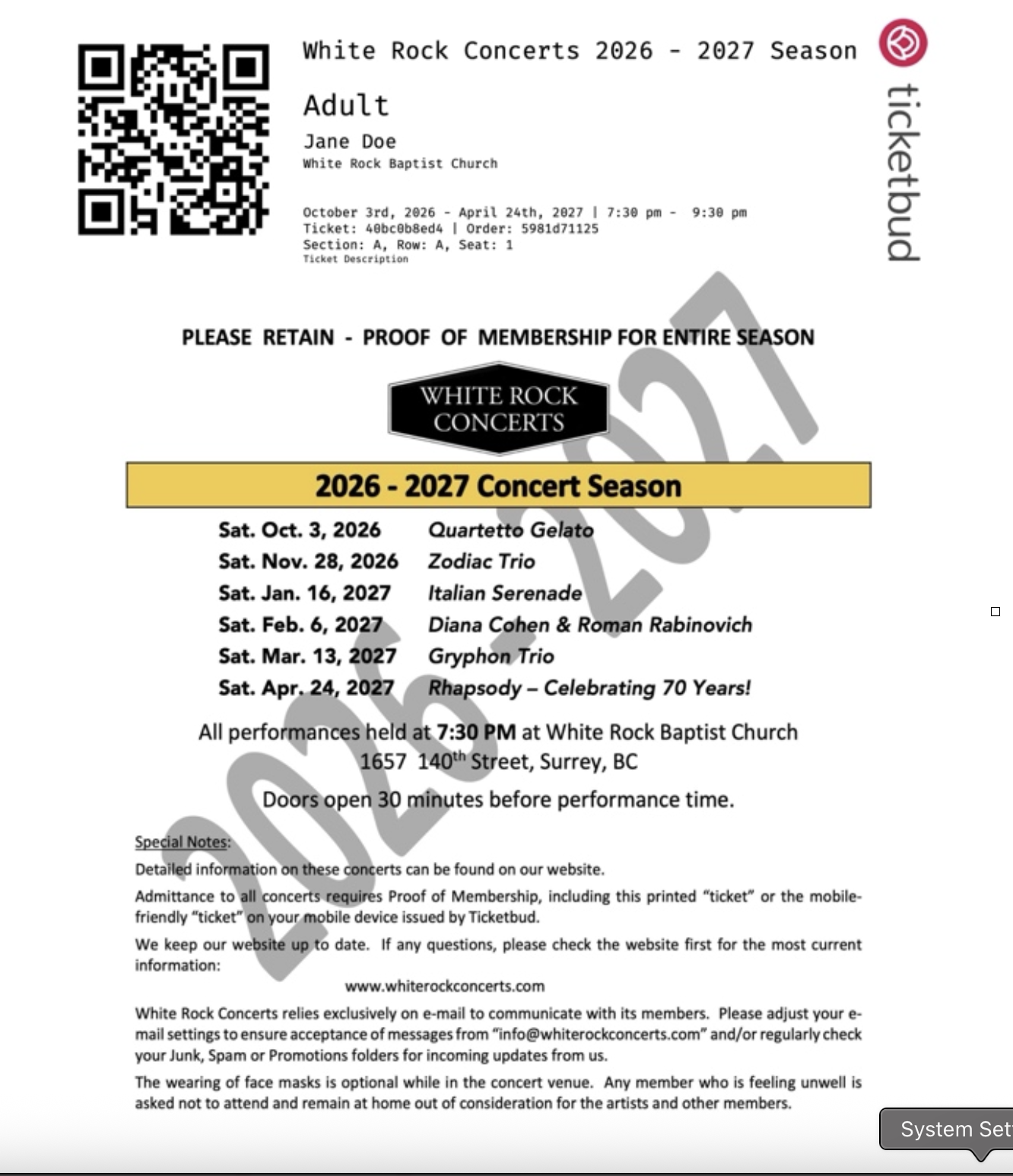Your Ticketbud Event “ticket” is your Proof of Membership for the entire concert season.